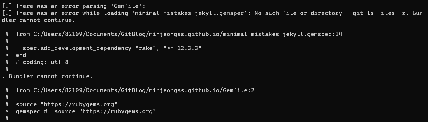 대략 하루 동안 Jekyll을 이용한 깃허브 블로그 생성을 진행했다. 수많은 에러를 마주쳤고 ruby와 jekyll에 어색한 본인은 구글링의 힘을 빌려 해결해나갔다. 예상외로 정확한 해결법을 찾기가 어려워 애를 먹었다. 특히 7번에서 해결하지 못한 에러는 해결하기 위해 minimal-mistakes의 원격 저장소에서 모든 Issue를 찾아보려고 시도까지 했다..😑